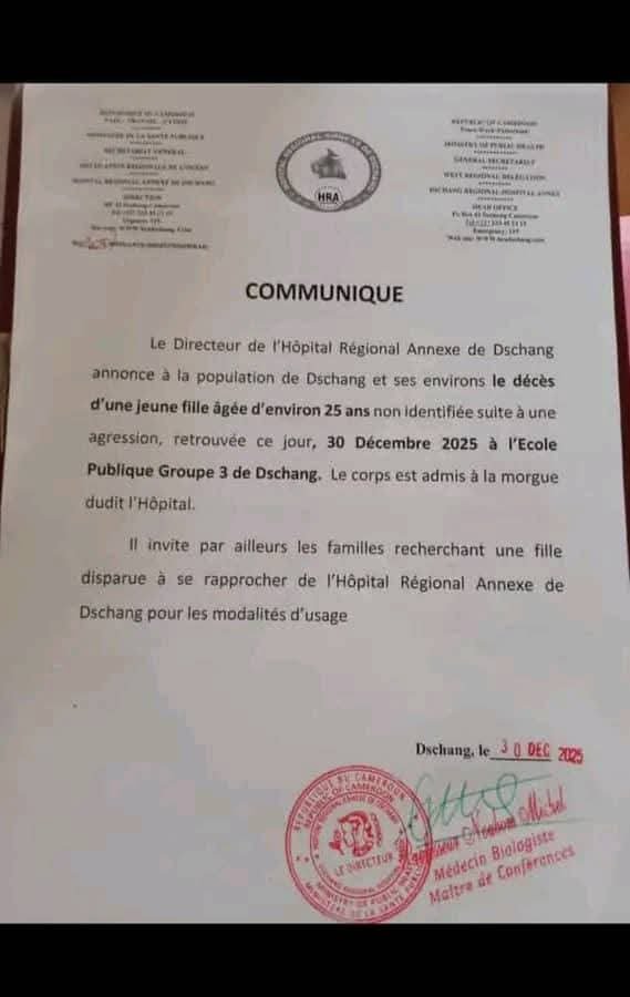 Dschang (Ouest-Cameroun) – La ville de Dschang est plongée dans l’émoi et l’indignation après la découverte du corps sans vie d’une jeune fille dans l’enceinte de l’École Publique Groupe 3. Le drame, survenu le mardi 30 décembre 2025, soulève de graves interrogations sur la sécurité urbaine et la protection des jeunes.La victime, identifiée après de longues heures d’attente, se nomme Tapen Didi, âgée de 19 ans. Élève en classe de seconde au lycée bilingue de Dschang, elle a été retrouvée sans vie dans un établissement scolaire primaire qui sert régulièrement de cadre à des cours de répétition, fréquentés par de nombreux élèves.Selon un communiqué officiel du Directeur de l’Hôpital Régional Annexe de Dschang, la jeune fille aurait été mortellement agressée. Le corps a été admis à la morgue de l’hôpital, tandis que les circonstances exactes du décès restent, à ce stade, non élucidées.L’identification de la victime n’a pas été immédiate. Il aura fallu près d’une journée entière et plusieurs appels à reconnaissance pour que la famille puisse être retrouvée, une situation qui a renforcé le sentiment de malaise au sein de la population.Dans le quartier, la consternation est générale. Habitants et parents d’élèves expriment leur inquiétude face à ce qu’ils décrivent comme une dégradation progressive de la sécurité.« Cette rue est devenue un lieu de prédilection pour les personnes mal intentionnées », confie un riverain.« Nous sommes choqués et surtout inquiets pour la sécurité de nos enfants », ajoute une mère de famille.L’école primaire concernée, située dans une zone fréquentée aussi bien en journée qu’en soirée, cristallise désormais les peurs. Pour de nombreux habitants, ce drame met en lumière l’urgence de renforcer la surveillance des espaces publics, en particulier ceux fréquentés par des jeunes et des élèves.Les autorités compétentes ont annoncé l’ouverture d’une enquête afin de faire toute la lumière sur ce crime et d’identifier le ou les auteurs. En attendant, la population de Dschang réclame vérité, justice et des mesures concrètes pour prévenir de nouveaux drames.Au-delà de l’émotion, ce décès tragique interroge la société sur sa capacité à protéger ses enfants et ses jeunes filles, et rappelle avec gravité que l’insécurité, lorsqu’elle s’installe, finit toujours par frapper les plus vulnérables.La rédaction d’Essentielle continuera de suivre cette affaire et d’informer ses lecteurs au fur et à mesure des développements.